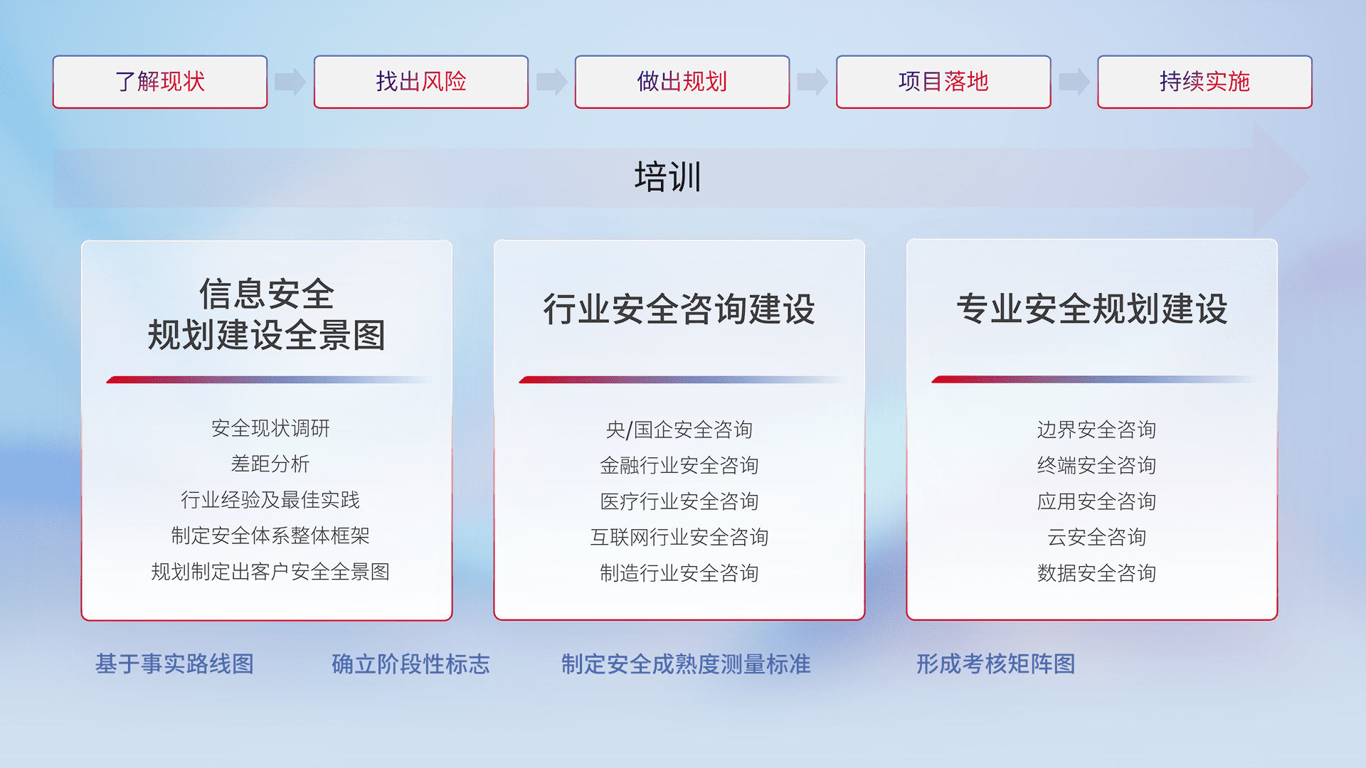 针对客户行业特性,,,以专业的安全服务+多厂商联合解决方案提供专属的一站式安全管理服务,,,,帮助客户全面感知网络空间威胁,,基于识别、、、检测、、、分析、、、、防护、、、、监测、、、、响应的服务理论模型,,,,从方案咨询、、集成交付、、评估验证、、优化加固、、、运维运营,,,,致力于为客户提供完整的闭环管理式安全服务。。。。以实战经验为客户打造高抵御风险的安全体系,,,帮助客户发现威胁、、、、对抗威胁、、、处置威胁,,,,不断积累安全对抗能力,,持续保障数字化安全。。。。