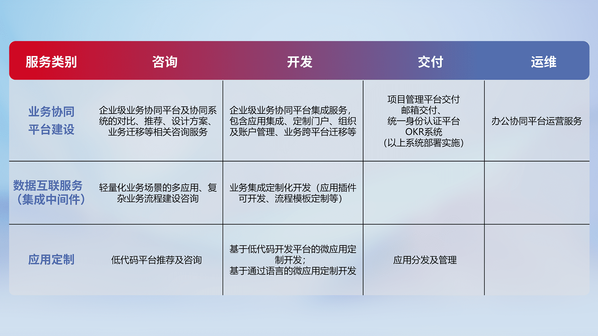 针对钉钉、、、、企微、、IDaas等平台级产品提供产品的规划、、方案、、交付、、、定制化开发等服务,,,,实现如统一协同办公、、、智能客户服务、、混合会议管理、、、、智能数据查询、、、、等业务场景,,,,实现数字化转型。。。